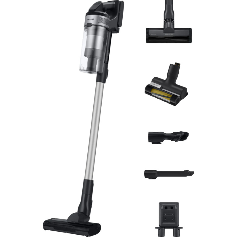 Maak verschillende soorten vloeren effectief schoon met de maximale zuigkracht van de Jet 65 Pet steelstofzuiger. De Digital Inverter Motor genereert totaal vermogen tot wel 410 watt en een zuigkracht tot maar liefst 150 watt. Het aerodynamisch ontworpen luchtsysteem, van de borstel tot de filter, optimaliseert de luchtstroom, en de multicyclonische luchtfilter minimaliseert het ontsnappen van fijne stofdeeltjes. Jet Cyclone Ervaar schone lucht en extreme zuigkracht dankzij de efficiënte multicyclonische structuur van de Jet Cyclone. Een optimaal luchtpad vermindert de luchtweerstand in het stofreservoir. De cycloon bestaat uit 9 cyclonen met in totaal 27 luchttoevoerpunten, wat zorgt voor een minimaal verlies van zuigkracht. Bovendien zorgt het systeem er ook voor dat het ontsnappen van fijne stofdeeltjes wordt geminimaliseerd. Filter Geeft schone lucht af dankzij een meerlaags filtratiesysteem dat 99,999%* van het stof** tegenhoudt. Als er lucht naar binnen wordt gezogen, scheidt de cyclonische hoofdfilter grote stofdeeltjes en vangt deze op in een metalen netfilter. De Jet Cyclone en microfilter filteren vervolgens fijne stofdeeltjes. Tot slot vangt een filter voor fijne stofdeeltjes het allerkleinste stof** op. Alle onderdelen en filters zijn wasbaar en blijven dus altijd hygiënisch schoon. Lichtgewicht design Maak je huis moeiteloos schoon met een gebruiksvriendelijke en wendbare stofzuiger. Dankzij het lichtgewicht ontwerp heb je maximaal gebruiksgemak en belast je je polsen minder. De steelstofzuiger zonder buis en borstel weegt slechts 1,48 kg. Je kunt dus gemakkelijk overal in huis schoonmaken, inclusief de zitoppervlakken van stoelen en banken, bovenop kasten en tafels en rolgordijnen, onder apparaten en op traptreden. Uitneembare en krachtige batterij Ervaar een lange schoonmaaktijd zonder op te laden, passend bij jouw levensstijl. Dankzij de krachtige batterij behoudt de stofzuiger zijn zuigkracht tot maar liefst 40 minuten. Bovendien kan de schoonmaaktijd eenvoudig worden verlengd tot 80 minuten met het gebruik van een reservebatterij (apart verkrijgbaar). Dankzij de technologie van Samsung blijft de batterij ook 70% van zijn oorspronkelijke prestaties leveren tot 500 cycli.