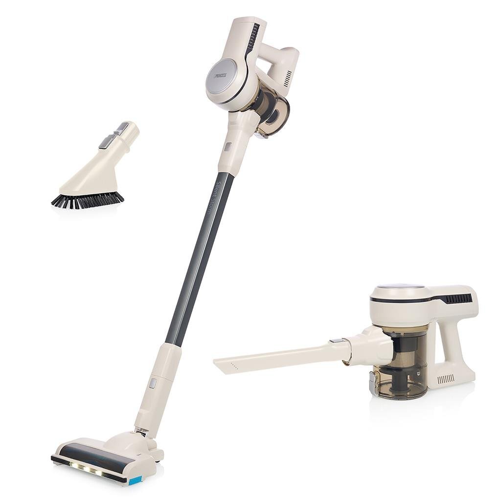 Stofzuigen wordt een fluitje van een cent met de Princess 339380 Silent Storm Draadloze Steelstofzuiger. Deze 2-in-1 stofzuiger kan omgebouwd worden tot een handige kruimelzuiger en is daarom erg flexibel in gebruik. Door de efficiënte DC motor zuigt hij met gemak alle kruimels en stof van de grond en zorgt hij snel voor een kruimelvrije vloer!Efficiënte DC motorThe Princess Silent Storm heeft een direct current (DC) motor met een zuigkracht van 11kPa en een vermogen van 140 Watt. Dit maakt hem erg krachtig en maakt snel korte metten met alle soorten vuil. Zelfs grove stofjes en vuiltjes worden naar binnengezogen en opgevangen in het stofreservoir. De steelstofzuiger heeft 3 snelheidsinstellingen en een accuduur van 30 minuten, zo maak jij gemakkelijk de hele bovenverdieping schoon. Is het tijd om op te laden? Haal dan gemakkelijk de verwijderbare batterij uit de stofzuiger en laadt deze op waar je maar wilt.Van alle gemakken voorzienWat de Silent Storm zo handig maakt is niet alleen zijn goede zuigkracht en lange gebruiksduur, maar heeft ook een hele handige parkeerfunctie. Hierdoor kan de stofzuiger blijven staan zonder ergens tegenaan te balanceren. Erg handig als je een meubel wil verplaatsen of wanneer je niet in de muren mag boren om de meegeleverde wandhouder op te hangen. Daarnaast heeft de Princess Steelstofzuiger een gemotoriseerde borstel met LED-lampje in de voet zodat je de kruimels altijd goed ziet liggen. Heb je een kruimelzuiger nodig? Haal dan de staaf van de main af en klik hier de kierenzuigmond of meubelborstel op! Handig toch?!Veelzijdige accessoiresDe Princess Draadloze Steelstofzuiger wordt geleverd met twee opzetstukken. Zo kun je erg handig gordijnen, meubels, roosters en kieren schoonmaken. Het opgezogen stof wordt opgevangen in het ruime stofreservoir van 600ml. Deze is op een hygienische manier schoon te maken door het gebruik van de kierenzuigmond in plaats van je handen. Super handig als je een tikkeltje smetvrees hebt. Ook wordt de stofzuiger geleverd met een extra HEPA filter. De HEPA filters zijn makkelijk schoon te maken met de handige cleaning tool. Dus is de een aan het drogen na reiniging, gebruik je gewoon de ander.Wat vind je in de doos?Princess Silent Storm Draadloze Steelstofzuiger, adapter, wandhouder, wandbevestiging, kierenzuigmond, meubelborstel, cleaning tool, extra HEPA filter en handleidingDe krachtige DC motor zorgt voor goede zuigkracht en heeft 3 snelheidsinstellingenDe stofzuiger heeft een accuduur van 30 minuten en kan erg lang mee tussen elke oplaadbeurtDankzij de handige parkeerfunctie kun je de stofzuiger overal neerzetten en heb je de wandhouder niet perse nodigHet stofreservoir kan makkelijk én hygiënisch geleegd worden door gebruik van de kierenzuigmondDoor de gemotoriseerde borstel met LED-lampje kan je stof en vuil altijd zien liggenEnergieStroombron: Batterij/AccuMaximaal ingangsvermogen: 140 WAccu/Batterij voltage: 22,2 VLooptijd: 30 minOplaadtijd: 4,5 uurErgonomieVerwijderbare filter: JaParkeerstand: JaIndicator voor volle stofreservoir: JaDesignStofzuigercontainer type: ZakloosKleur van het product: GrijsStof capaciteit: 0,6 lAfneembare kruimeldief: JaPrestatieSoort reiniging: DroogStofzuiger luchtfiltering: HEPAVuilafscheidingsmethode: Cyclonaal/filteringGeluidsniveau: 75 dB